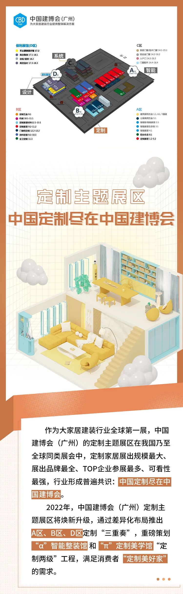 2022年,中國建博會(廣州)將依據(jù)行業(yè)需求,設立定制、智能、系統(tǒng)和設計四大主題展區(qū)。其中,定制主題展區(qū)將以“中國定制盡在中國建博會”為定位,以“定制美好家”為主題,通過優(yōu)化展區(qū)布局,更全面地展現(xiàn)行業(yè)新賽道,更深入地挖掘行業(yè)新模式,致力于為行業(yè)、市場、消費者展現(xiàn)當前和未來的整家居住體驗場景。
