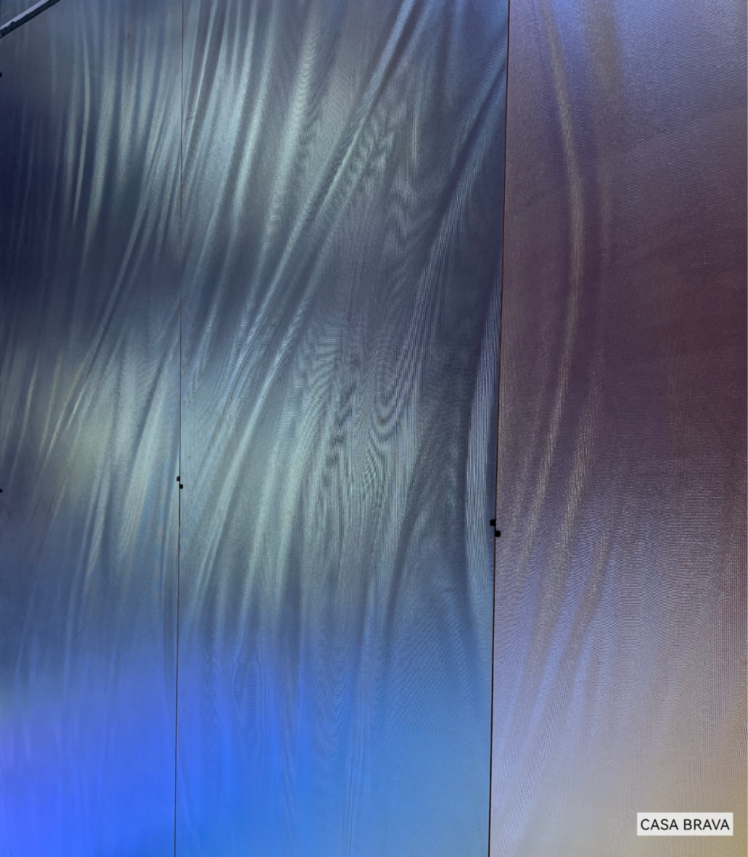 無(wú)論是用在金屬、玻璃或樹脂中,流體外觀都會(huì)激發(fā)迷人趣味,帶來(lái)別樣的空間感知。令人著迷的波紋和旋渦效果會(huì)吸引觀眾走近細(xì)看。流體效果模糊了虛擬和現(xiàn)實(shí)之間的界限如CASA BRAVA巧妙的結(jié)合流線與光澤表面,呼應(yīng)了數(shù)字現(xiàn)實(shí)的趨勢(shì)。