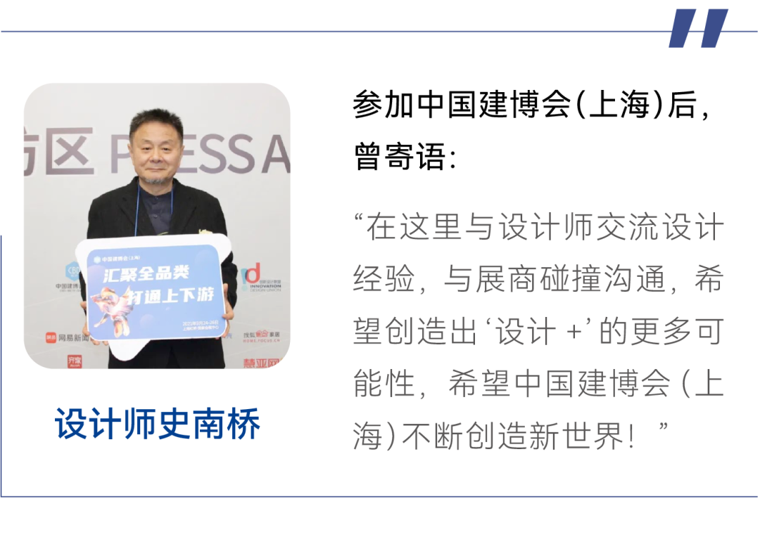 眾多設(shè)計(jì)大咖也在參加中國(guó)建博會(huì)(上海)之后紛紛表示,不管是上海地區(qū)的民眾還是全國(guó)觀眾,希望可以來(lái)到展會(huì)現(xiàn)場(chǎng)看看,整個(gè)行業(yè)市場(chǎng)是向上發(fā)展的,對(duì)未來(lái)也是充滿信心的。