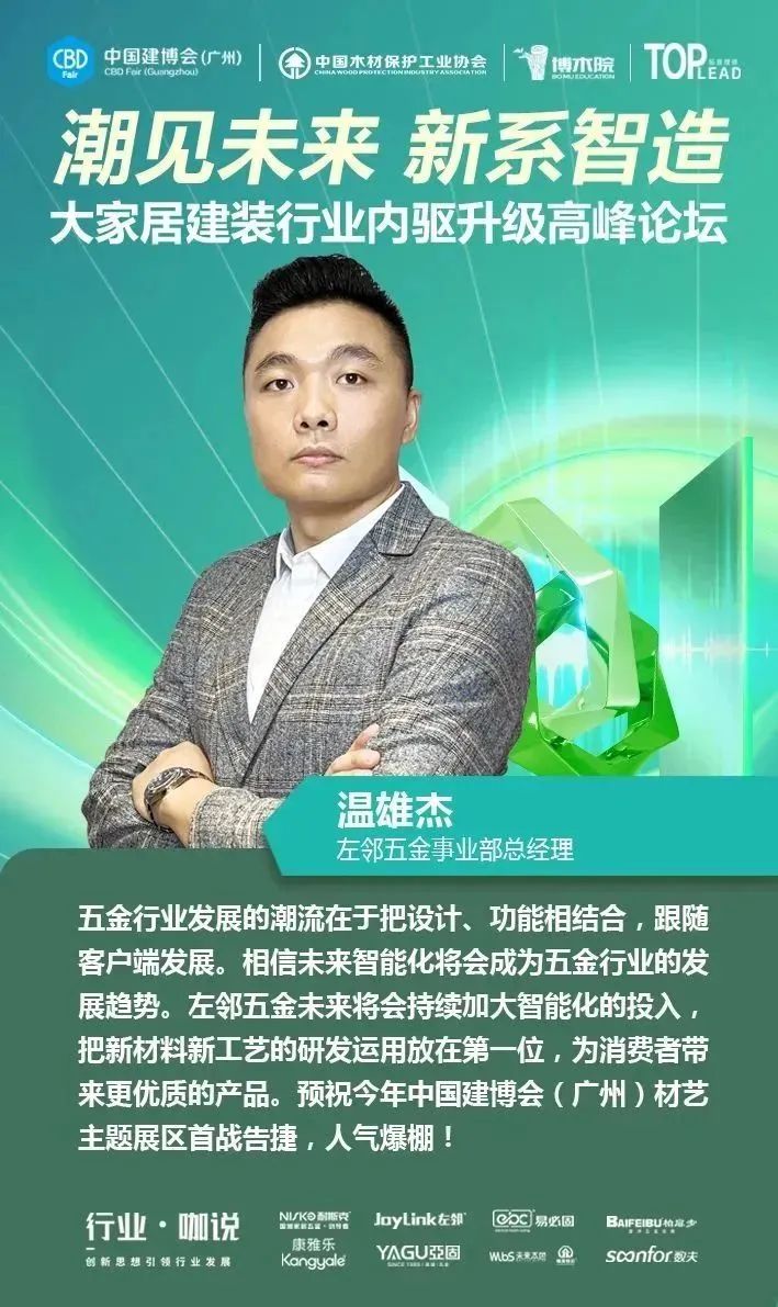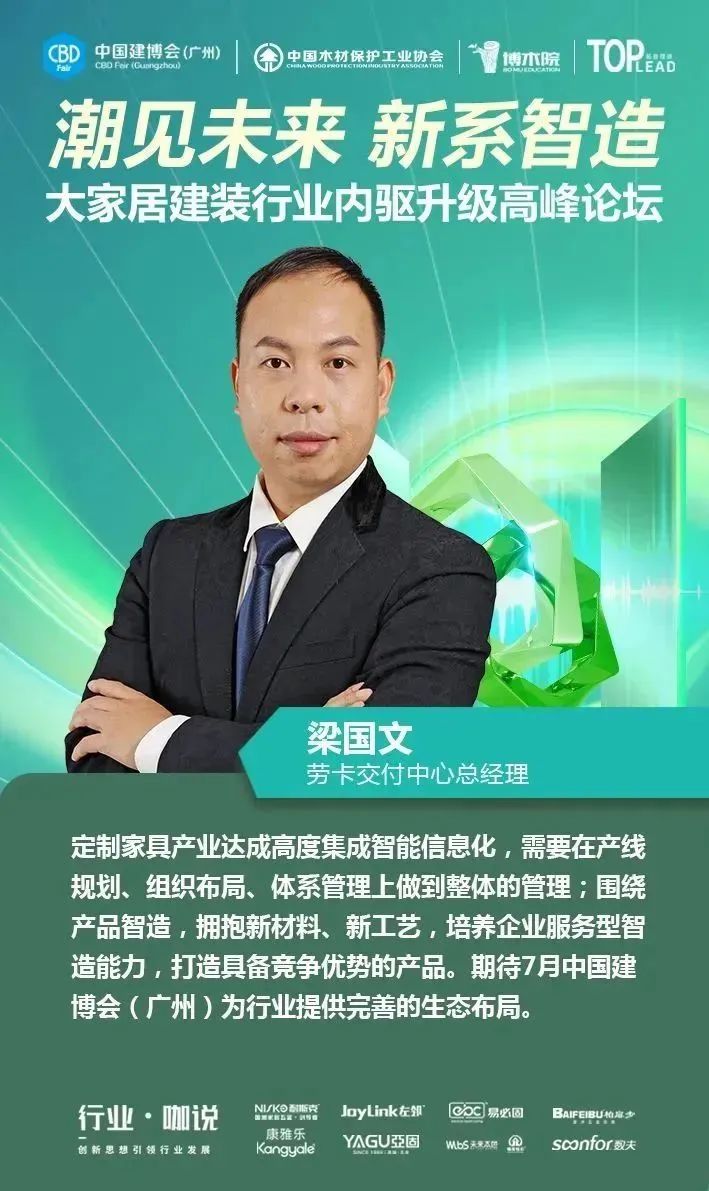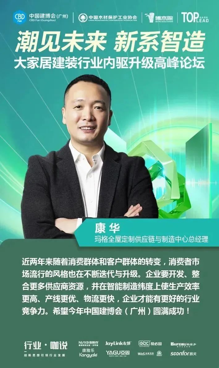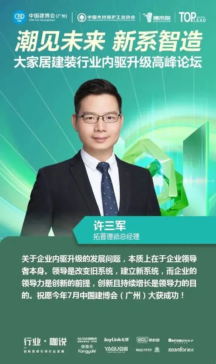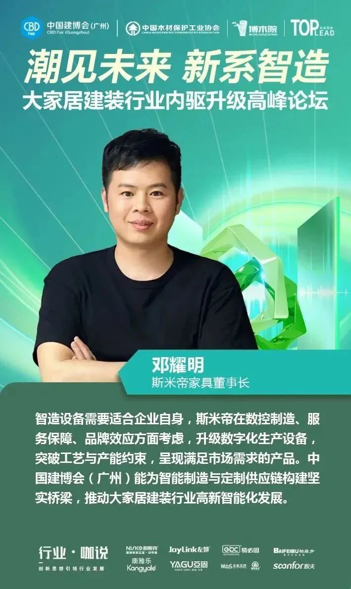 4月12日,中國(guó)對(duì)外貿(mào)易中心集團(tuán)有限公司旗下的中國(guó)建博會(huì)(廣州)聯(lián)合中國(guó)木材保護(hù)工業(yè)協(xié)會(huì)、博木院、拓普理德,在廣交會(huì)威斯汀酒店隆重舉行“【潮見(jiàn)未來(lái) 新系智造】大家居建裝供應(yīng)鏈內(nèi)驅(qū)升級(jí)高峰論壇”,并舉辦了2023中國(guó)建博會(huì)(廣州)“大家居建裝供應(yīng)鏈星舞臺(tái)”啟動(dòng)儀式。本場(chǎng)論壇得到了耐斯克集團(tuán)、左鄰五金、易必固、未來(lái)本色、聯(lián)迅、康雅樂(lè)、亞固、數(shù)夫軟件的大力支持,現(xiàn)場(chǎng)匯聚了150多位大家居建裝行業(yè)上下游產(chǎn)業(yè)鏈的企業(yè)家、行業(yè)大咖、設(shè)計(jì)師等專業(yè)人士,一同探尋企業(yè)內(nèi)驅(qū)升級(jí)的領(lǐng)軍解決方案,共同探討行業(yè)上下游供應(yīng)鏈通道,助力大家居建裝行業(yè)實(shí)現(xiàn)全鏈協(xié)同創(chuàng)新發(fā)展。
