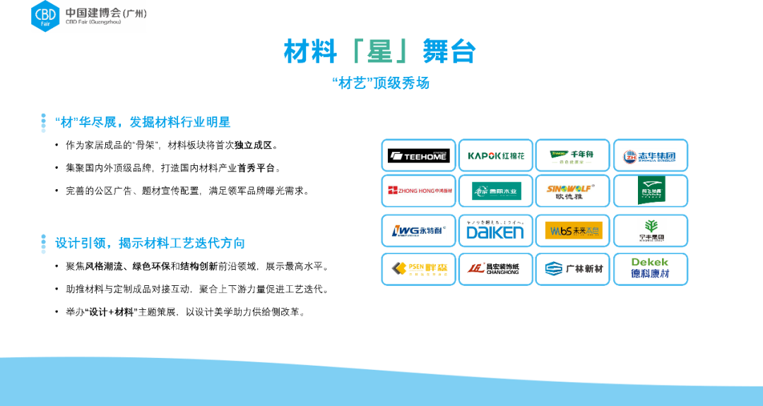 2023年,中國(guó)建博會(huì)(廣州)順應(yīng)大家居建裝供應(yīng)鏈的創(chuàng)新引領(lǐng)趨勢(shì),在廣交會(huì)展館C區(qū)新設(shè)立以“材料”和“工藝”為展示核心要素的“材藝”主題展區(qū),充分發(fā)揮大家居建裝行業(yè)供應(yīng)鏈各題材的聚集效應(yīng),開(kāi)辟新領(lǐng)域,制勝新賽道。