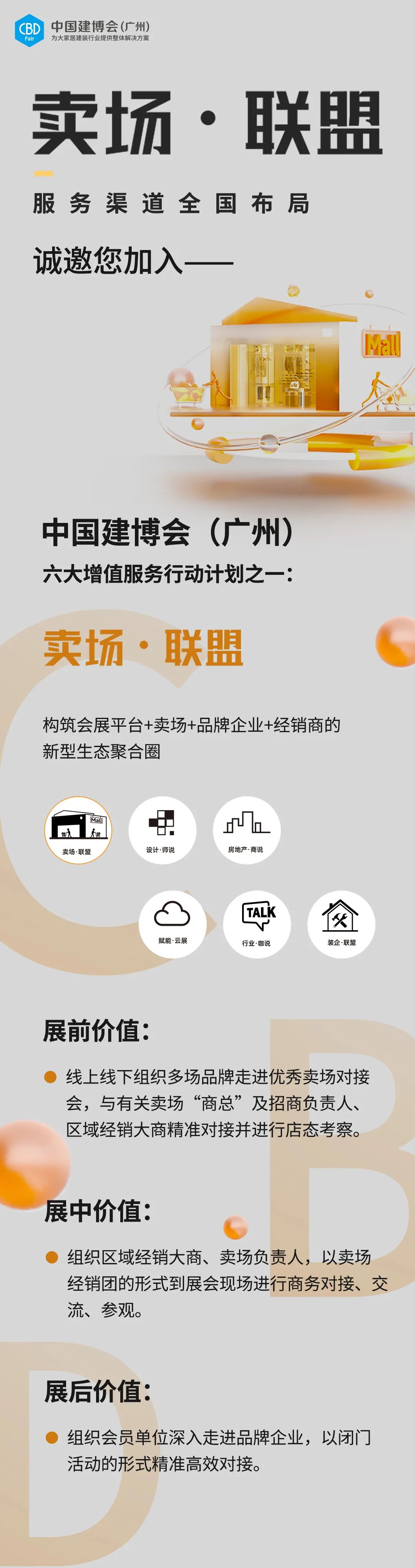 作為大家居建裝行業(yè)全球第一展,中國建博會(廣州)針對參展企業(yè)的選商、育商、優(yōu)商需求,協(xié)同全國多家連鎖賣場和區(qū)域優(yōu)秀賣場,精選當(dāng)?shù)卮笊?,重磅推出“賣場·聯(lián)盟”增值服務(wù),聚焦經(jīng)銷商和加盟商渠道,以賣場為發(fā)力點(diǎn),構(gòu)筑“會展平臺+賣場+品牌企業(yè)+經(jīng)銷商”的新型生態(tài)聚合圈,助力參展企業(yè)、賣場、經(jīng)銷商之間實(shí)現(xiàn)高效對接,共謀發(fā)展。