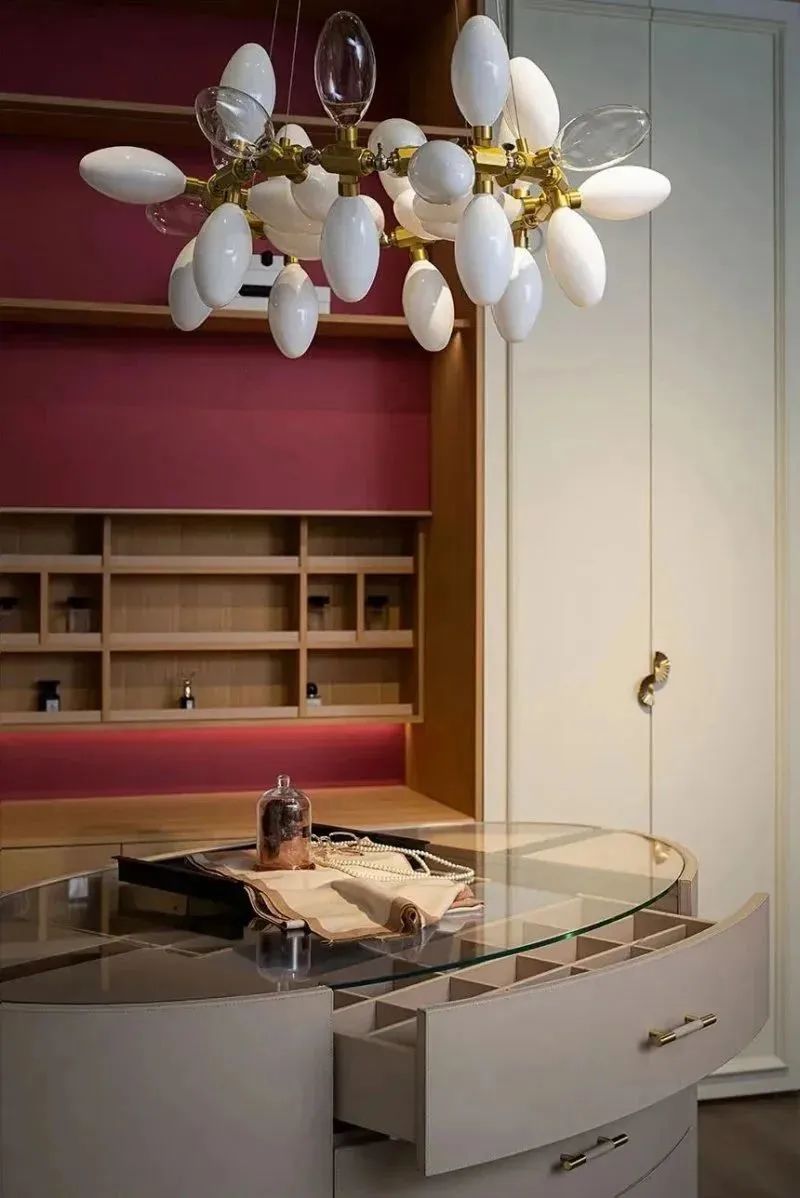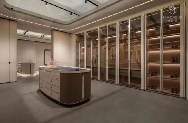 A8空間帶來了“隱奢生活”,包括廚房空間、客廳電視柜與衣帽間。其中國潮衣帽間,產(chǎn)品中的背景墻將木皮與彩貝相拼接,將現(xiàn)代設(shè)計與傳統(tǒng)手工藝做了融合。而這種將東西方屬性融合的方式,也讓人們開始真正反思什么才是屬于當代國人的高定生活。