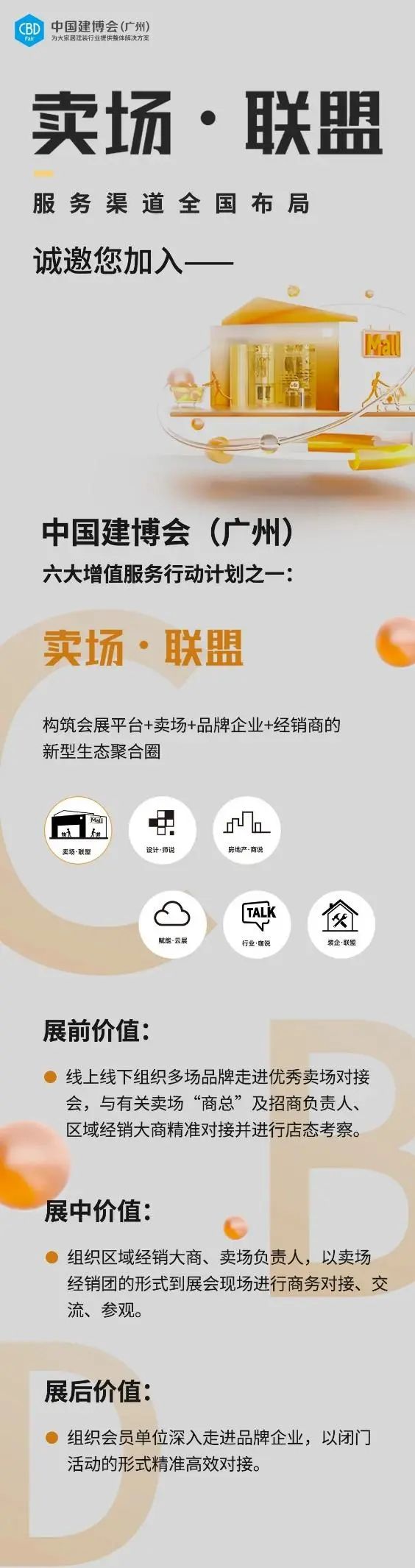 面對(duì)愈演愈烈的經(jīng)銷商爭奪戰(zhàn),家居賣場(chǎng)作為流通渠道的重要載體,成為品牌企業(yè)拓展優(yōu)質(zhì)經(jīng)銷商的關(guān)鍵鏈路。中國建博會(huì)(廣州)作為“大家居建裝行業(yè)全球第一展”,聯(lián)合全國及有關(guān)區(qū)域知名的賣場(chǎng),聚焦經(jīng)銷商和加盟商渠道,以賣場(chǎng)為發(fā)力點(diǎn),針對(duì)參展企業(yè)的選商、優(yōu)商、育商需求,構(gòu)筑會(huì)展平臺(tái)+賣場(chǎng)+品牌企業(yè)+經(jīng)銷商的新型生態(tài)聚合圈,為品牌拓渠道,為大商選品牌,助力參展企業(yè)、賣場(chǎng)、經(jīng)銷商之間實(shí)現(xiàn)高效對(duì)接。