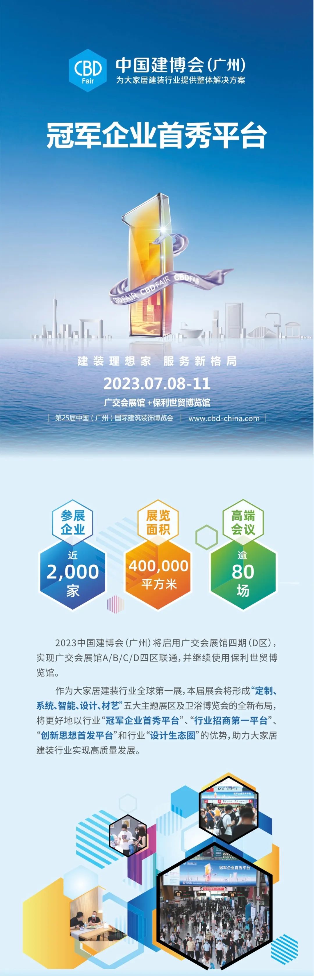 作為大家居建裝行業(yè)全球第一展,2023中國建博會(廣州)將形成“定制、系統(tǒng)、智能、設計、材藝”五大主題展區(qū)及衛(wèi)浴博覽會的全新布局,參展企業(yè)近2000家、展覽面積40萬平方米,將更好地以行業(yè)“冠軍企業(yè)首秀平臺”“行業(yè)招商第一平臺”“創(chuàng)新思想首發(fā)平臺”和行業(yè)“設計生態(tài)圈”的優(yōu)勢,助力大家居建裝行業(yè)實現高質量發(fā)展。