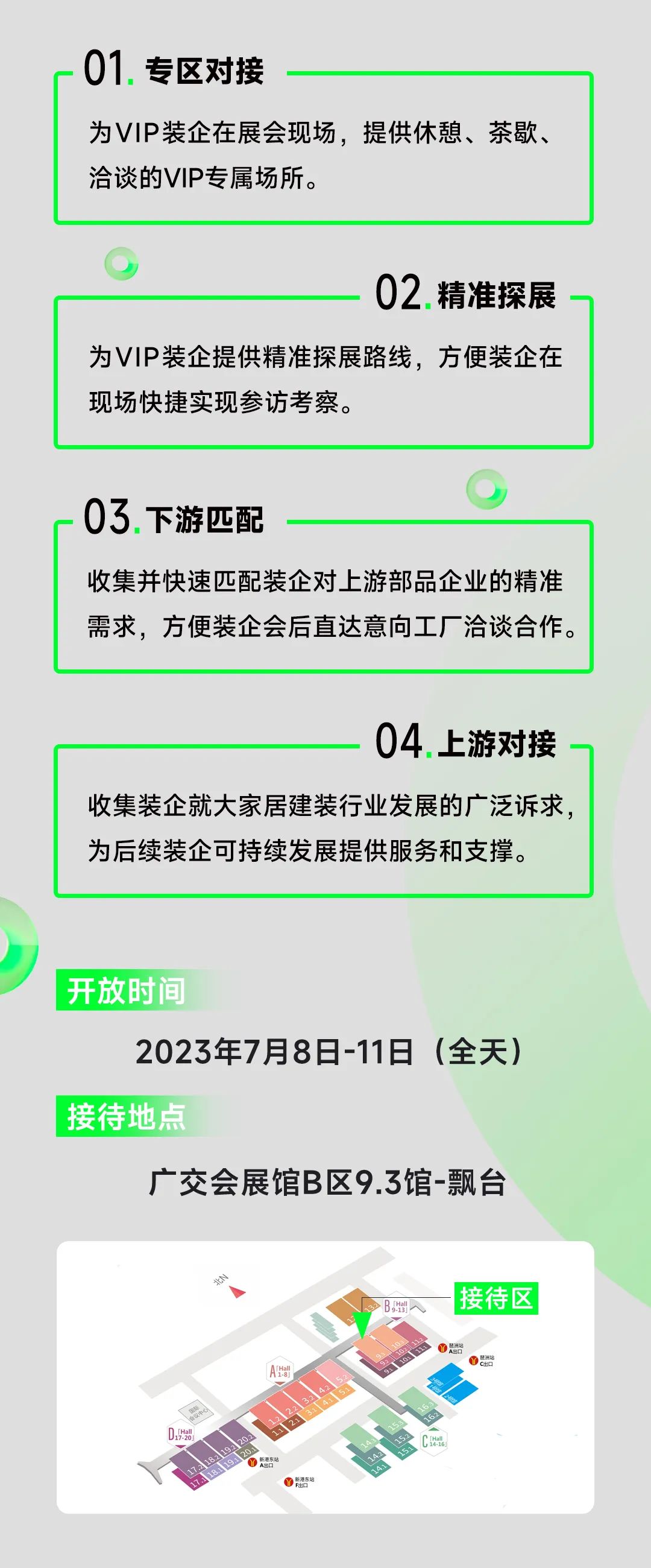 “裝企·聯(lián)盟”服務(wù)對(duì)接區(qū)與VIP入場(chǎng)快速通道,也將于7月8日-11日在展會(huì)期間呈現(xiàn),助力來自全國(guó)的龍頭裝企及從業(yè)人士與參展商實(shí)現(xiàn)精準(zhǔn)高效對(duì)接。