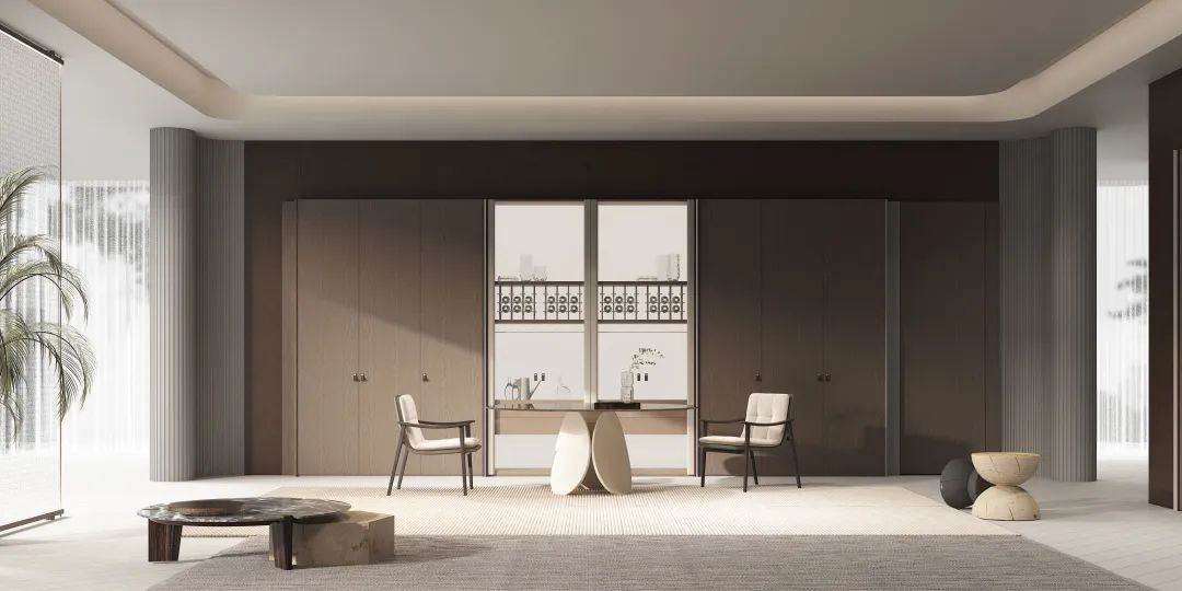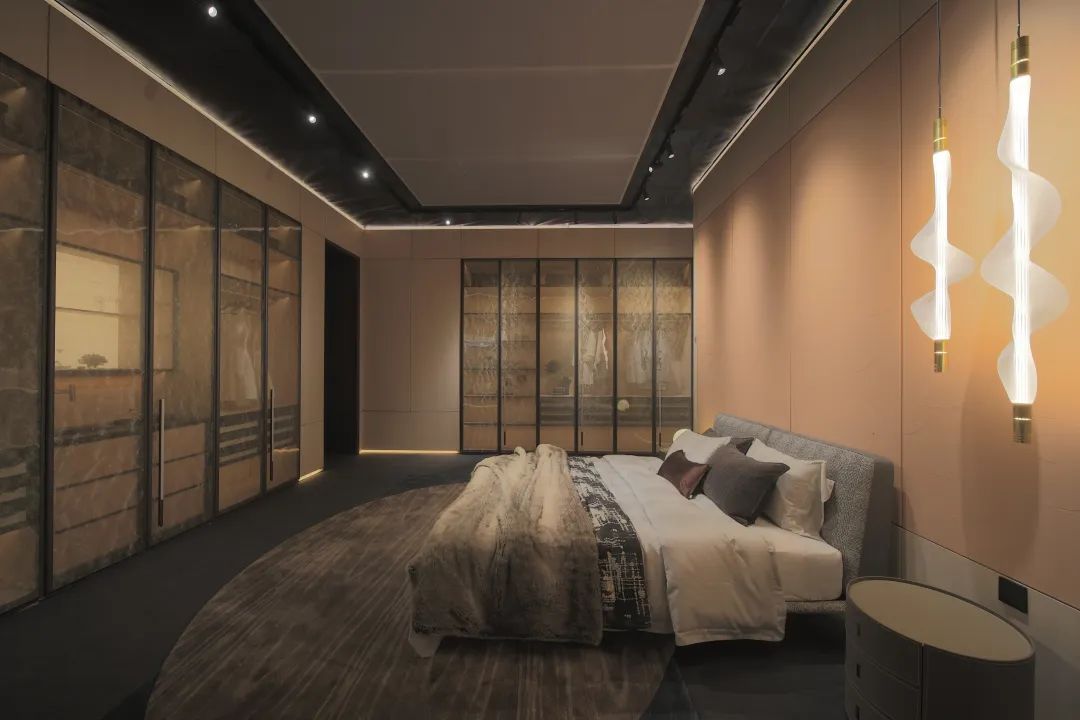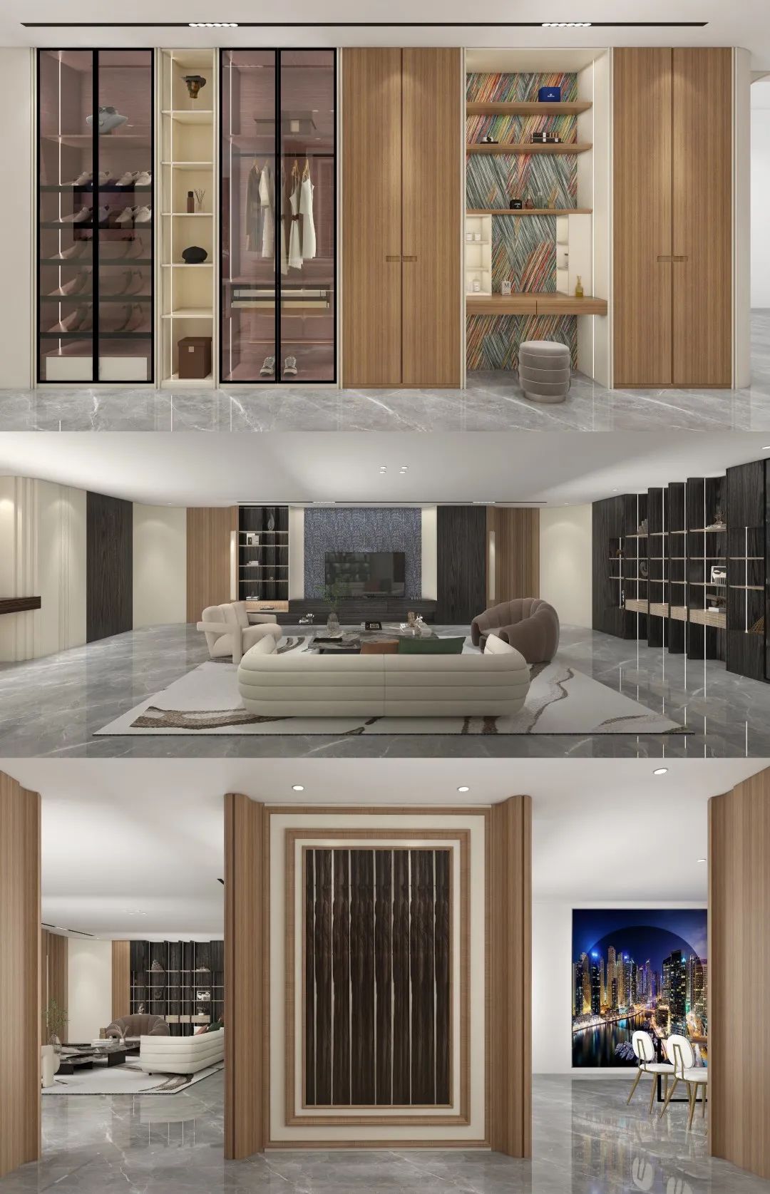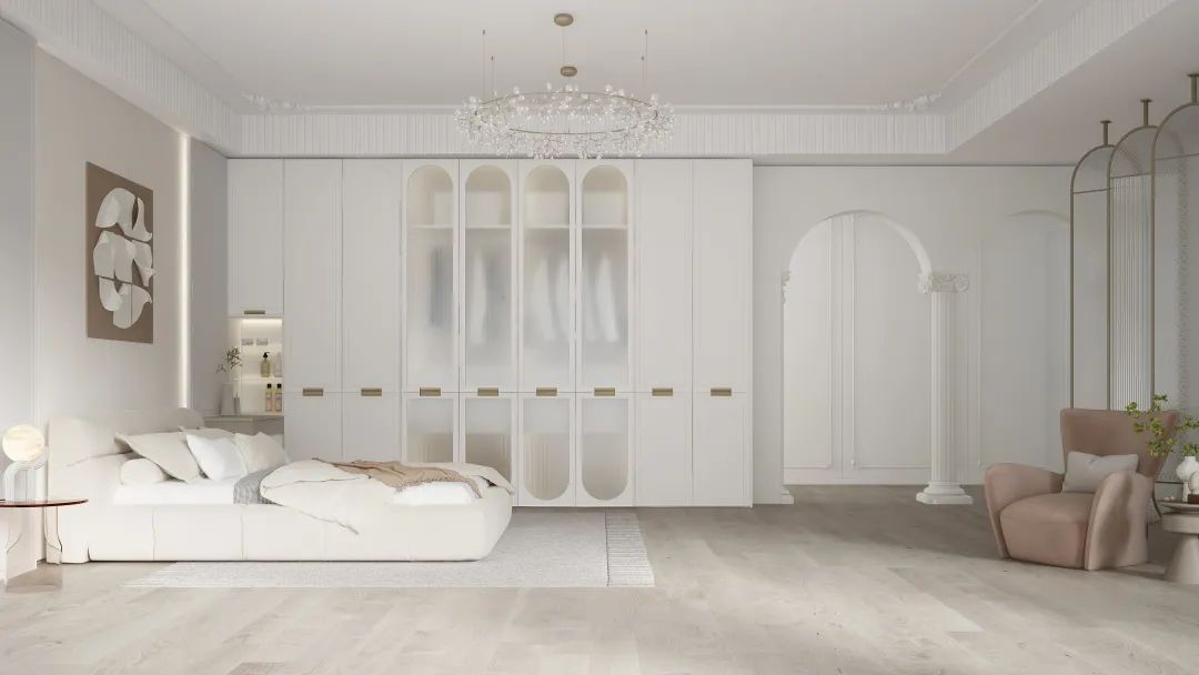 貝拉系列——曲線優(yōu)美的貝殼與圣潔月光完美融合,打造出如夢如幻的輕法式浪漫主義??臻g整體色調(diào)柔和,奶白色、奶咖色、奶灰色互相融合,賦予空間溫柔的力量。細節(jié)上,懸空式床頭柜與衣柜形成一體,簡潔大氣,視覺質(zhì)感極佳。拱形掩門結(jié)合同款玻璃門搭配嵌入式金色拉手,在收納與展示中尋找平衡,創(chuàng)造出精致的空間狀態(tài)。新貴系列——以曲線、圓弧、斜邊切線的造型,亮啞光的烤漆材質(zhì),強調(diào)事物本真的內(nèi)斂和克制,打造新貴的藝術(shù)空間。不同色調(diào)在空間肆意揮灑,奇妙碰撞,激活視覺層次。上下倒圓的通高門,結(jié)合極具辨識度的菱格背板,通過玻璃層板燈的映射,高貴典雅的氣質(zhì)在空間得到完整呈現(xiàn)。
