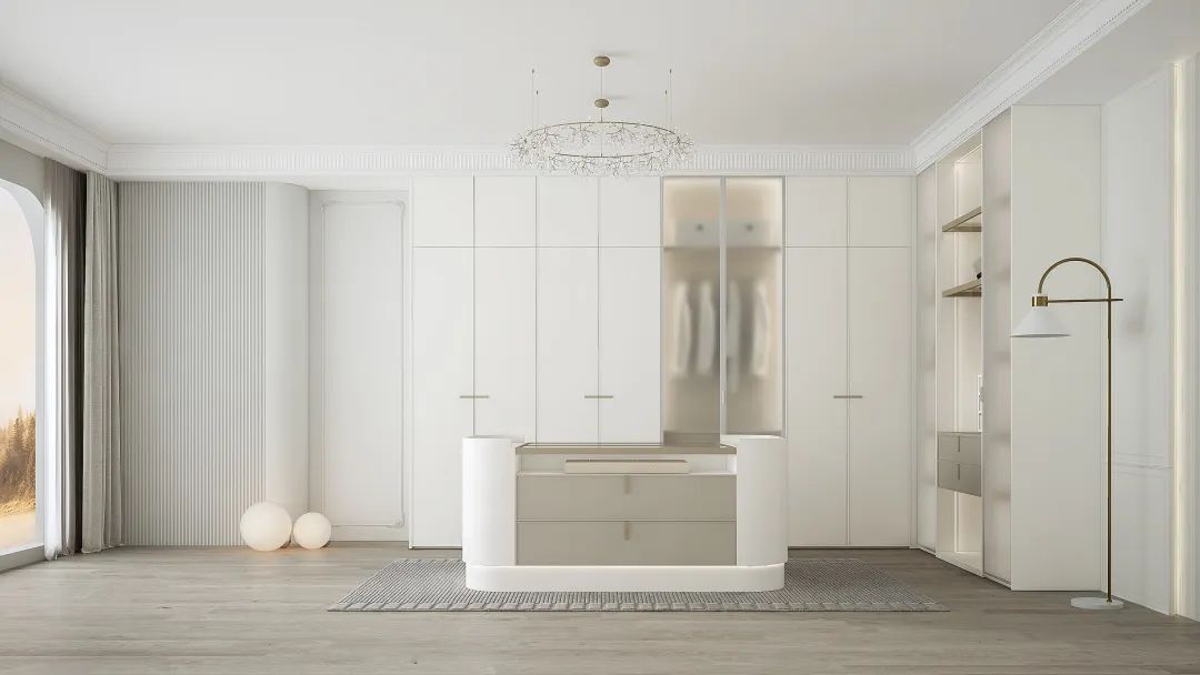 U型衣帽間設計,給予空間更多組合可能性,通過材質(zhì)與色彩的穿插,傳遞出穩(wěn)重的氣氛與精致的格調(diào),嵌入式拉手抽面去除過多的繁雜的雕飾,賦予簡潔、流暢的線條與柜板融合為一體,美觀時尚。