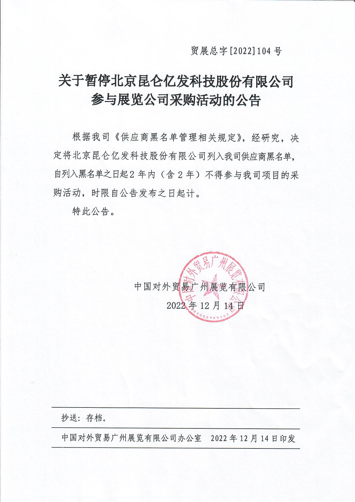 關于暫停北京昆侖億發(fā)科技股份有限公司參與展覽公司采購活動的公告